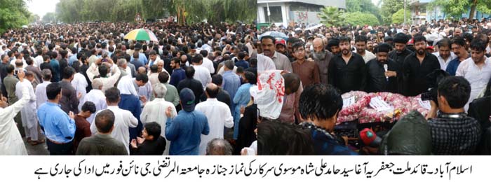 ISLAMABAD, July 26: The Quaid e Millat e Jafariya Agha Syed Hamid Ali Shah Moosavi laid to rest on Monday here amid sighs and sobs at the central Imam Bargah G -9/ 4 |