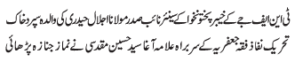 RAWALPINDI, December 17: Wife of the Nazamal Ammor of the TNFJ Rawalpindi region, Allama Matloob Hussain Taqi passed away; Agha Muqadasi conveyed his condolences |