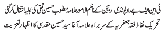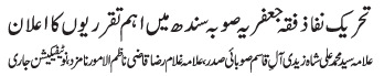 RAWALPINDI, December 5: Allama Syed Mohammad Ali Shah Zaidi Aale Qasim and Allama Ghulam Raza Qazi has been nominated as the president of TNFJ Sindh and Nazim Alamoor TNFJ Sindh respectively |