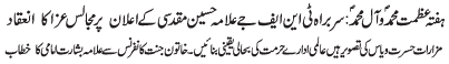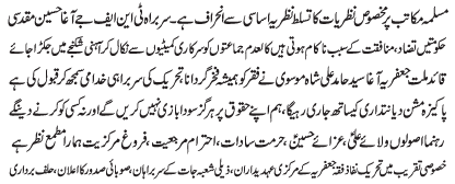 ISLAMABAD, December 7: The president of the TNFJ, Allama Syed Hussain Muqadasi announced the observation of Hafta e Azmat e Mohammad O Aale Mohammad |