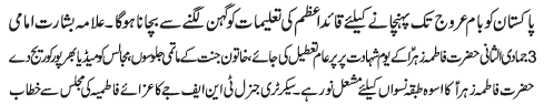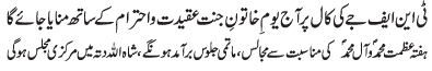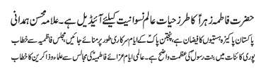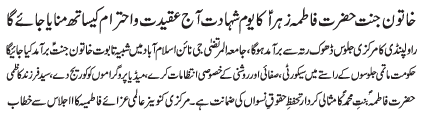 ISLAMABAD, December 8: On the call of the TNFJ, today Youme Khatoon e Jannat will be commemorated with great religious zeal and reverence |