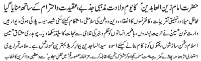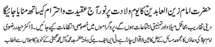 RAWALPINDI, December 10: Youme Waladat e Purnoor of Hazrat Imam Zain Al Abideen (AS) will be celebrated with great religious zeal and reverence |
