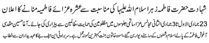 ISLAMABAD, December 15: Ashra e Azae Fatimiya will be commemorated to mark the Shahadat of Hazrat Fatima Zahra (SA) |