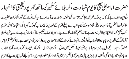 ISLAMABAD, February 5: Today Youme Shahadat Hazrat Imam Ali Naqi (AS) will be commemorated; solidarity will be expressed with the oppressed of Karbalae Kashmir |