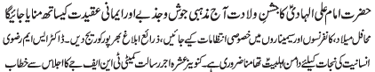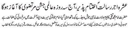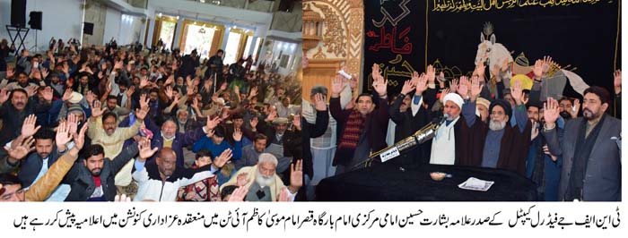 ISLAMABAD, February 1: Tehreek Nafaz e Fiqh e Jafariya announced the observation of the Aalmi Ashrae Ajre Rasalat from 1-10 Rajab Almurajab |