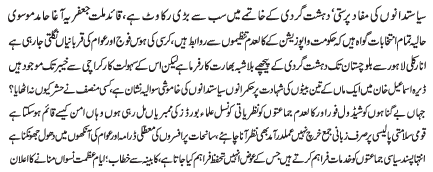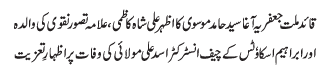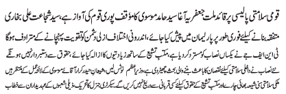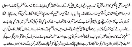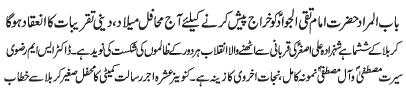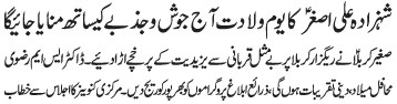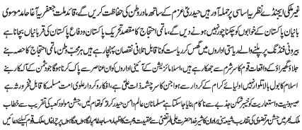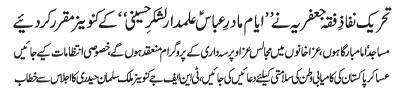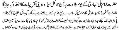 ISLAMABAD, February 20: The Tehreek Nafaz e Fiqh e Jafariya announced the observation of 22 Rajab "Yuome Sadiq Aale Mohammad" |