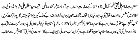 ISLAMABAD, February 11: As a first step against discrimination against Shia school and violation of rights, 25 Rajab’s nationwide mourning day will proof a slap on the face of tyranny and Yazdiyyat - Hamid Moosavi |