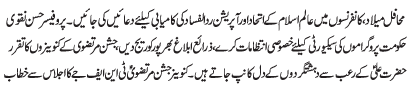 ISLAMABAD, February 13: Special prayers must be offered during Mahafil, Milaad and conferences for the unity of the Islamic world and success of operation Radal Fasad - Prof. Hassan Naqvi |