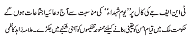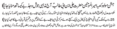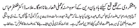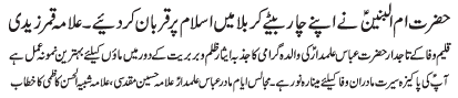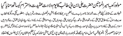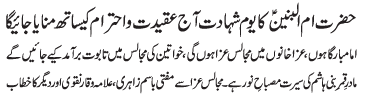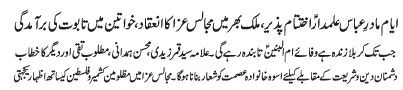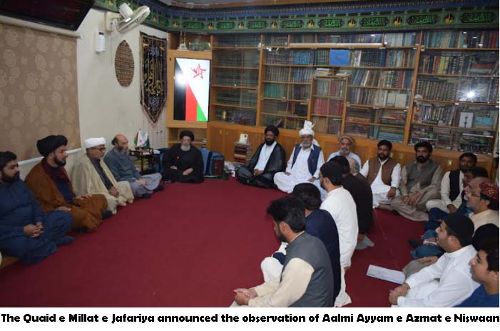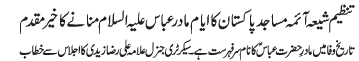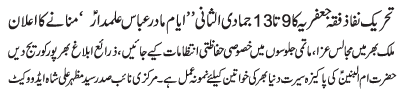 | ISLAMABAD, January 11: Tehreek Nafaz e Fiqh e Jafariya announced the observation of the "Ayyam e Madre Abbas Alamdar (AS)" from 9-13 Jamadiul Thani | ||