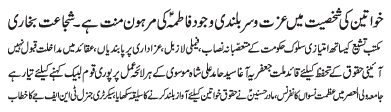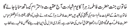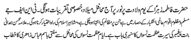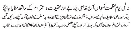 | ISLAMABAD, January 24: Today Aalmi Youme Azmat e Niswaan will be celebrated with great religious zeal and reverence | ||