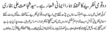 | ISLAMABAD, January 13: Defending the "Two Nations Theory" is a part of our faith - Shuja'at Bukhari | ||