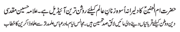 ISLAMABAD, February 17: Today Youm e Sharikatal Hussain (SA) will be commemorated to mark the martyrdom of Hazrat Zainab Binte Ali (SA) |