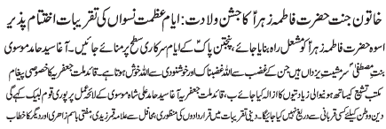 | ISLAMABAD, January 26: Programs of Ayyam e Azmat e Niswaan concluded, Mahafil held to mark Zahoor Purnoor of Hazrat Fatima Zahra (SA) | ||