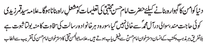 ISLAMABAD, January 27: In order to turn this world into a hub of peace, the pious teachings of Imam Hassan (AS) must be adopted - Qamar Zaidi |