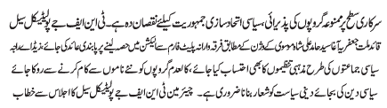 ISLAMABAD, December 1: On the governmental level welcoming of the proscribed groups and political alliance is danger for democracy - TNFJ Political Cell |