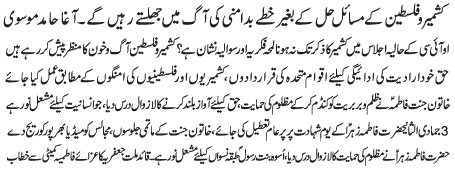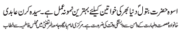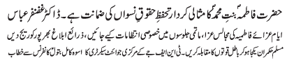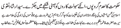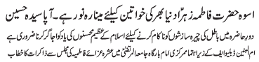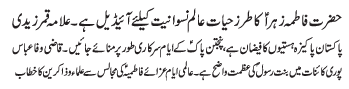 | ISLAMABAD, January 24: Today Aalmi Youme Azmat e Niswaan will be celebrated with great religious zeal and reverence | ||