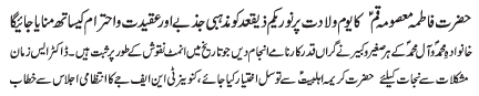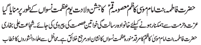 | ISLAMABAD, June 2: Jashan of Zahoor Pur Noor of Hazrat Fatima Binte Imam Mousa Kazim (AS), Masooma e Qum (SA) was celebrated as Youme Azmate Niswaan | ||