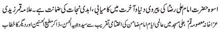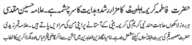 ISLAMABAD, June 3: The Shrine of Hazrat Kareemae Ahlebat (AS) is the source of guidance for all of humanity - Allama Muqadasi |