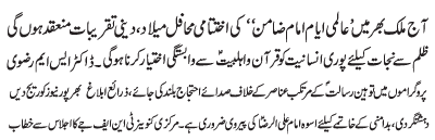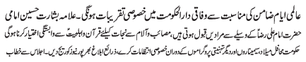 ISLAMABAD, June 11: Today Mahafile Meelad and religious gatherings will be held in connection with the "Aalmi Ayyame Imam e Zamin (AS)" throughout the country |