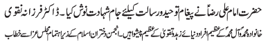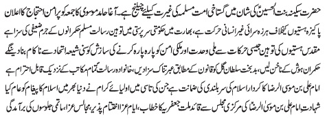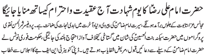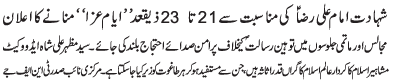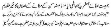 ISLAMABAD, June 18: TNFJ announced the observation of Ayyam e Aza from 21 to 23 Zeeqaad to mark the martyrdom anniversary of Imam Ali Raza (AS) |