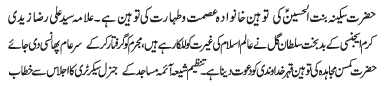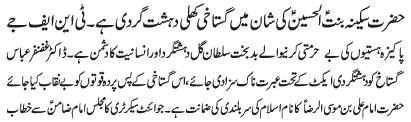 ISLAMABAD, June 20: Blasphemy against Hazrat Sakina Bintal Hussain (SA) is an act of Blasphemy against the Prophet hood and an open act of terrorism |