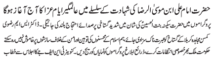 ISLAMABAD, June 21: The "Aalmgheer Ayyam e Aza" in connection with the martyrdom anniversary of Hazrat Imam Ali bin Mousa Al Raza (AS) will begin today |