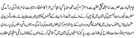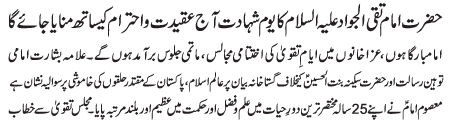 ISLAMABAD, June 29: The martyrdom of Hazrat Imam Taqi Al Jawad (AS) will be commemorated today with great religious zeal and reverence |