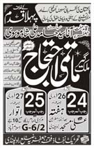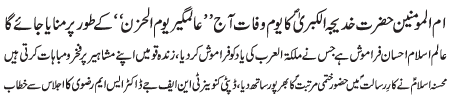 | ISLAMABAD, April 12: The sad demise of Hazrat Khadija tal KUbra (SA) will be commemorated as Alamgheer Youmal Huzn | ||