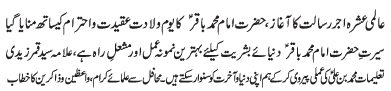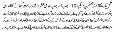 ISLAMABAD, February 1: Tehreek Nafaz e Fiqh e Jafariya announced the observation of the Aalmi Ashrae Ajre Rasalat from 1-10 Rajab Almurajab |
