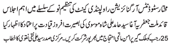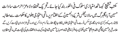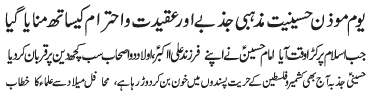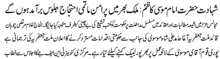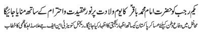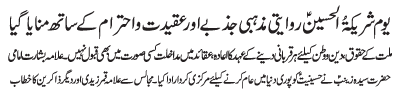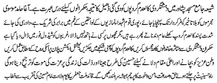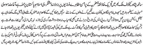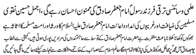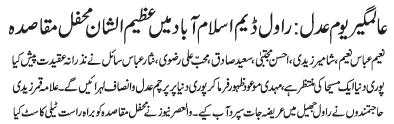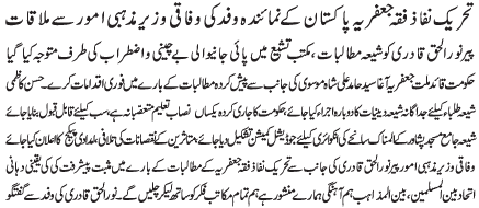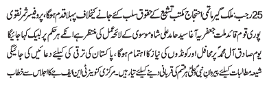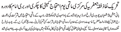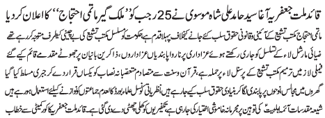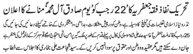 ISLAMABAD, February 20: The Tehreek Nafaz e Fiqh e Jafariya announced the observation of 22 Rajab "Yuome Sadiq Aale Mohammad" |