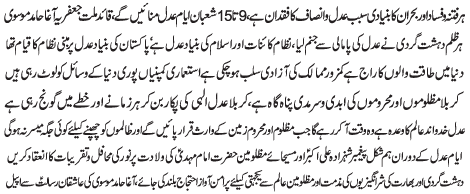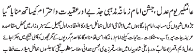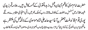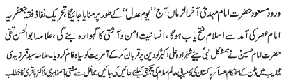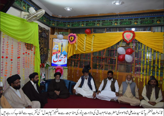 | ISLAMABAD, March 13: Agha Syed Hamid Ali Shah Moosavi has announced to celebrate Ayyam e Adal (i.e. The Days of Justice) from 9th to 15th Shaban | ||