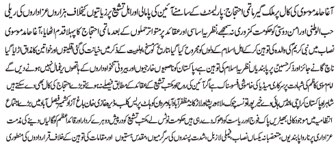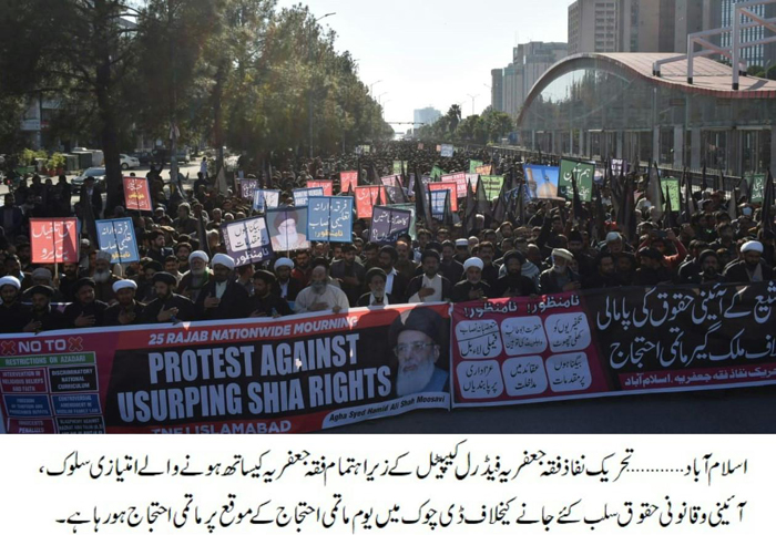 ISLAMABAD, February 28: Matami Protests on the call of Quaid e Millat e Jafariya Agha Syed Hamid Ali Shah Moosavi, were held across Pakistan on Sunday, 25th of Rajab against steps contrary to the ideology and constitution of Pakistan as well as discrimination against the followers of Maktab e Tashayyo |