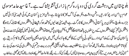 ISLAMABAD, March 4: Terrorism is again on the rise in Balochistan which is a matter of grave concern - Hamid Moosavi |
