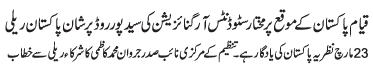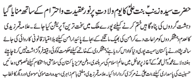 | ISLAMABAD, April 6: Today the "Youme Khatoon e Jannat (SA)" was commemorated with great religious zeal and reverence | ||