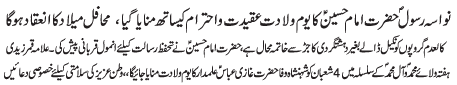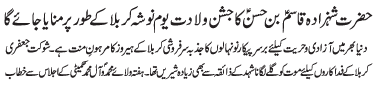 RAWALPINDI, March 11: Jashan Zahoor Purnoor of Hazrat Shahzada Qasim Bin Hassan (AS) will be celebrated as Noshah e Karbala |