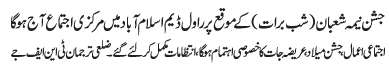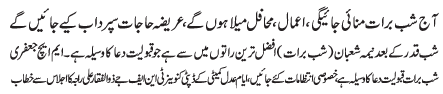 ISLAMABAD, March 18: Today Shab e Baraat will be celebrated; Mahafil will be held Areza Jaat will be handed over to water |