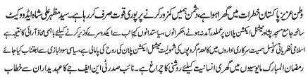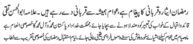 | ISLAMABAD, April 2: The Tehreek Nafaz e Fiqh e Jafariya announced the schedule of Ramzan Programs | ||