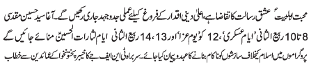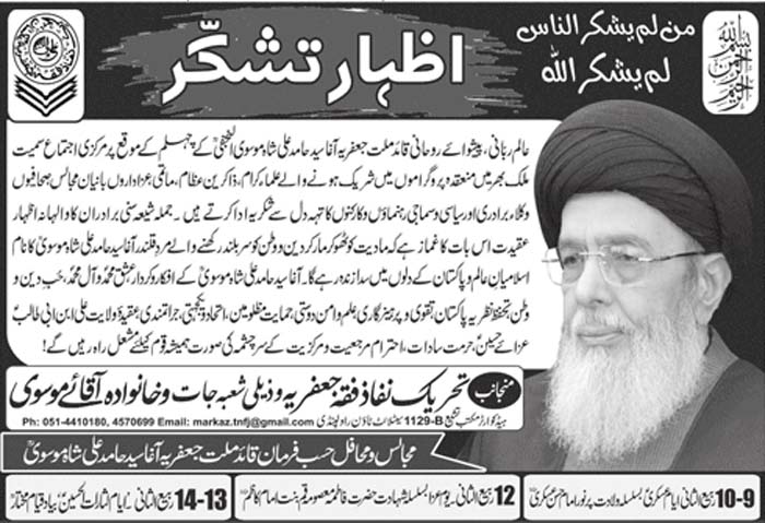 | ISLAMABAD, November 6: Head of the Tehreek Nafaz e Fiqh e Jafariya Allama Agha Syed Hussain Muqadasi will visit today the Holy Shrine of Bari Imam and the shrines of other saintly figures of Islamabad | ||