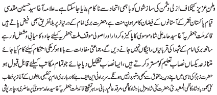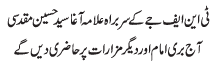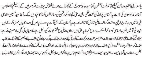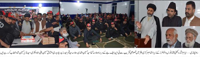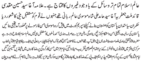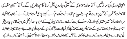 RAWALPINDI, October 30: The newly elected Chief of Tehreek e Nifaz e Fiqah Jafariya Pakistan Allama Agha Syed Hussain Muqaddasi vowed to stick to the path of the Quaid e Millat e Jafaria Agha Syed Hamid Ali Shah Moosavi |