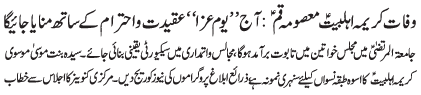 | ISLAMABAD, November 9: Shahadat of Hazrat Masooma e Qum (SA) Binte Hazrat Imam Mousa e Qazim (AS)was observed with religious respect and reverence | ||