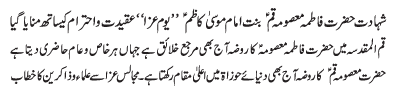 | ISLAMABAD, November 8: Youme Aza is being observed with respect and reverence to mark the martyrdom anniversary of Kareema e Ahlebait (AS), Masooma e Qum (SA) | ||