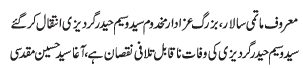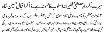 RAWALPINDI, November 22: Syed Mazloom Hussain Shah was instigator of unity amongst all schools of thought and was a selfless campaigner of Aqae Moosavi - Hussain Muqadasi |