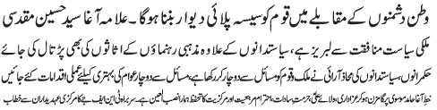 ISLAMABAD, November 26: The Chief of Tehreek e Nifaz e Fiqah Jafariya Allama Agha Syed Hussain Muqaddasi has appealed to the politicians to stop dragging Pakistan’s armed forces in their political conflicts |