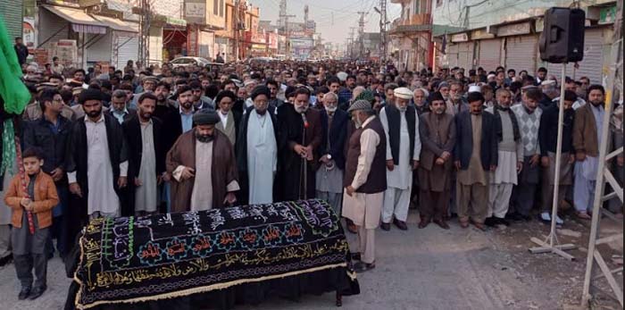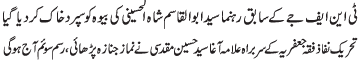 RAWALPINDI, November 24: TNFJ former activist, Syed Abual Qasim Shah Alhussaini's wife laid to rest; president of the TNFJ, Agha Muqadasi led the funeral prayer |