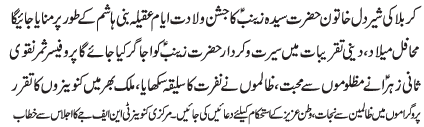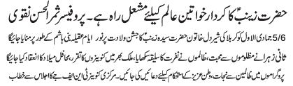 ISLAMABAD, November 30: The Zahoor Purnoor of the lion hearted lady of Karbala, Hazrat Syeda Zainab (SA) will be celebrated today as Youme Aqeelae Bani Hashim |