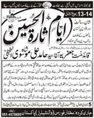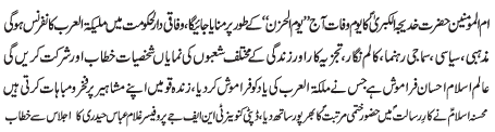 ISLAMABAD, April 1: Youme Wafat of Ummal Momineen Hazrat Khadijatal Kubra (SA) will be commemorated today as Youmal Huzn; Conference "Maleekatal Arab" will be held in Islamabad |