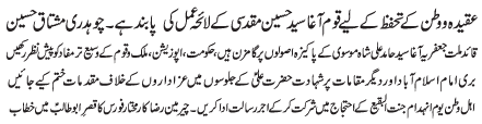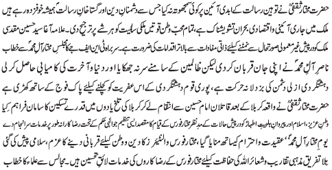 RAWALPINDI, April 26: We will follow stance taken by the chief of TNFJ, Agha Hussain Muqadasi to protect the religion and the beloved country - Ch Mushtaq Hussain |