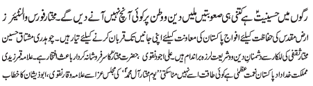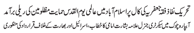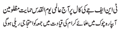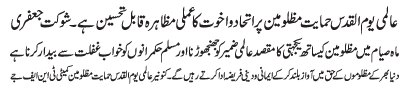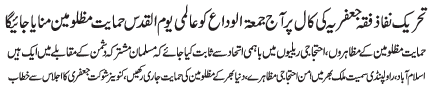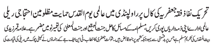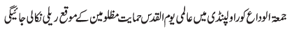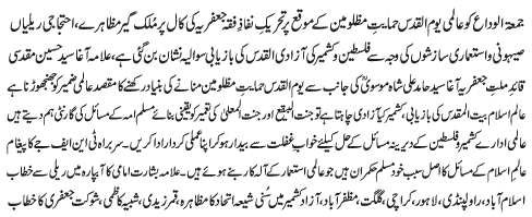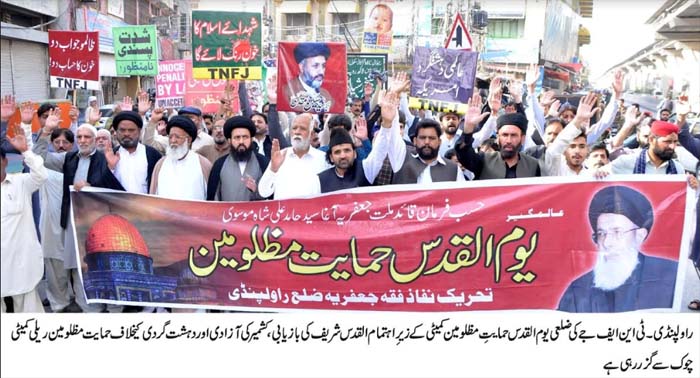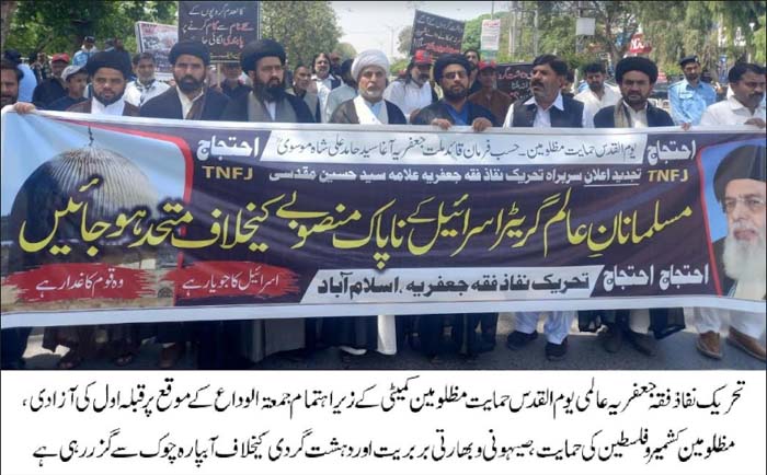 RAWALPINDI, April 14: On the call of the TNFJ, today Jumatal Wida will be observed as Youmal Quds Hameyat e Mazlomeen. to express solidarity with the oppressed of the world |