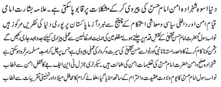 ISLAMABAD, April 6: Today the "Youme Aman" will be celebrated to mark the Zahoor Purnoor of Imam Hassan Mujtaba (AS) |