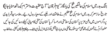 RAWALPINDI, April 8: The victory of Islam in Jang e Badr will be celebrated with great respect and reverence as the "Youme Furqan" |